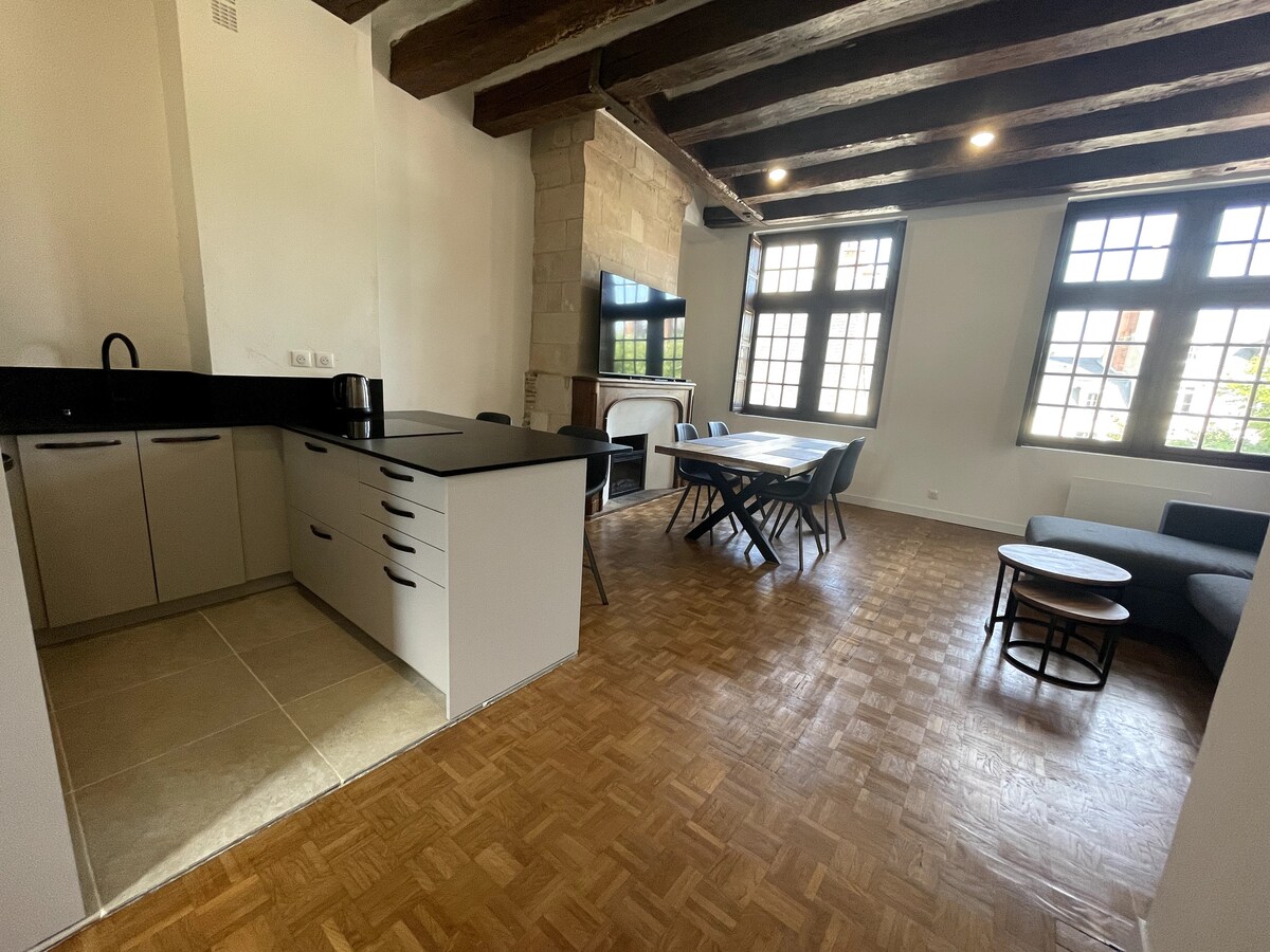 XXL-Loft von 200 m² im historischen Herzen von Tours, in einer sehr ruhigen Straße. Geschlossene Privatgarage direkt von der Wohnung aus zugänglich (Parkplatz inklusive). 2 Schlafzimmer, 2 Bäder, große Küche (30 m²) und spektakuläres Wohnzimmer (85 m²). Schnelles WLAN (157 Mb/s) + dedizierter Arbeitsbereich: ideal für Tourismus & Telearbeit. Wir sind Gastronomen aus der Touraine, wir lieben es, Gäste zu empfangen und sind sehr verfügbar. Möglichkeit der Einrichtung eines Babysitting-Service auf Anfrage.