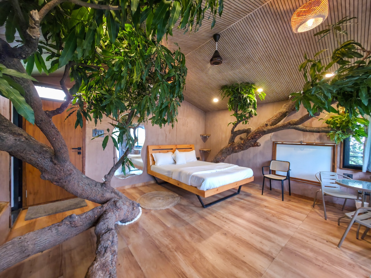 Sutra liegt an einem Mangobaum mit atemberaubendem Tal- und Bergblick und ist ein einzigartiges Baumhaus, in dem die Natur mit dir lebt — der Baum selbst wächst im Raum. Es verbindet nachhaltiges Design mit modernen Annehmlichkeiten und bietet Komfort, Charme und eine private Terrasse zum Entspannen. Perfekt für Paare, Alleinreisende oder eine kleine Familie von drei Personen, die eine ruhige Flucht in die Wildnis suchen.