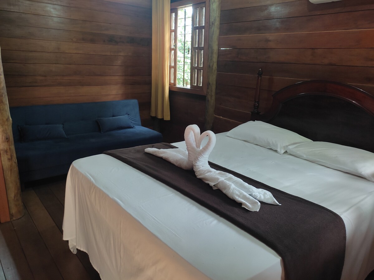 Willkommen im Acquamarine Park Hotel, Partnerhotel von Acquamania, dem besten Wasserpark in Espírito Santo! Wir befinden uns in der Stadt Guarapari/ES, nur 80 Meter vom Park entfernt, so nah, dass du zu Fuß gehen kannst. Unser charmantes Chalet verfügt über ein Doppelbett, ein Sofa, eine Klimaanlage, einen TV, eine Minibar und ein eigenes Badezimmer mit einem Whirlpool sowie einen Balkon mit Blick auf den Garten. In deiner Buchung wirst du Frühstück haben und du kannst unseren gesamten Freizeitbereich genießen.