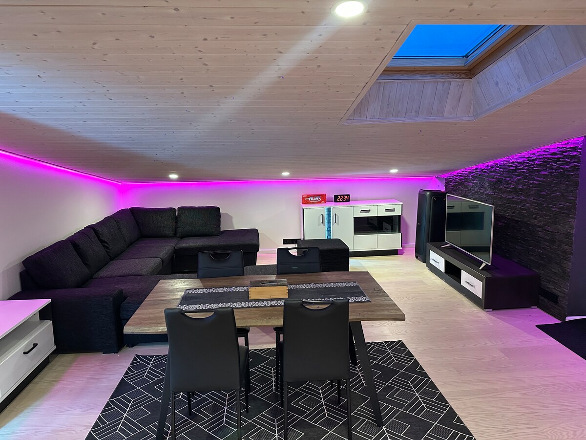 Entfliehe nach HyggeViljandi, deinem gemütlichen Rückzugsort, wo Stil auf Gelassenheit trifft. Dieser wunderschön gestaltete Raum verbindet Komfort und Eleganz und lädt zum Entspannen ein. Genieße luxuriöse Schlafzimmer mit Betten in Hotelqualität, weichen Möbeln und weicher Beleuchtung, die eine warme, hygge Atmosphäre schaffen. Zu den Annehmlichkeiten gehören eine voll ausgestattete Küche, eine ruhige Leseecke und ein eigener Balkon. Genieße das Wohnzimmer mit SmartTVs und entspanne dich in der Sauna. Perfekt für Familien und Gruppen, die gemeinsam unvergessliche Momente suchen!