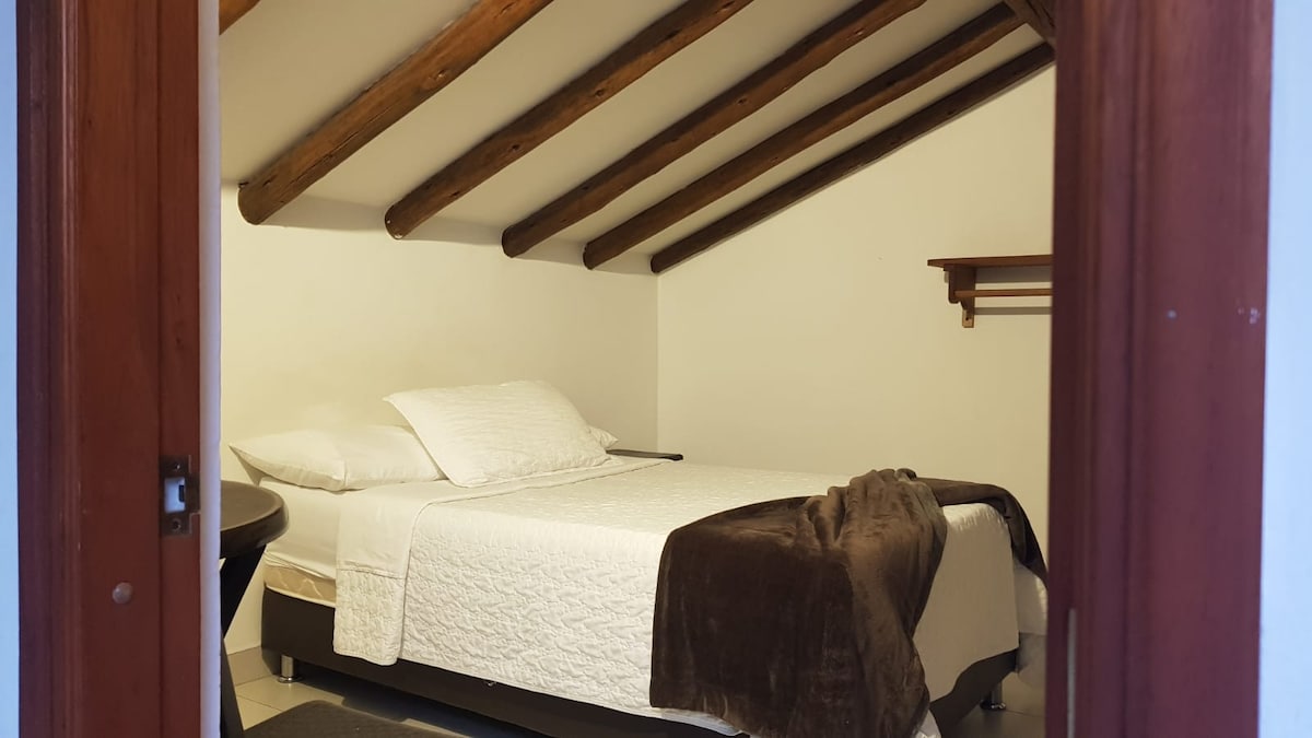 Esta linda habitación se encuentra en Casa Pancha Mama con una excelente ubicación a solo dos cuadras de la plaza principal. Es Ideal para que una pareja pase unos dias romanticos explorando la encantadora Villa de Leyva. Es amplia y acogedora aequipada con una cama doble y un banio completo . La habitacion tiene una hermosa vista al patio de la casa y a las montañas. Un delicioso desayuno esta incuido en el precio de la habitación.