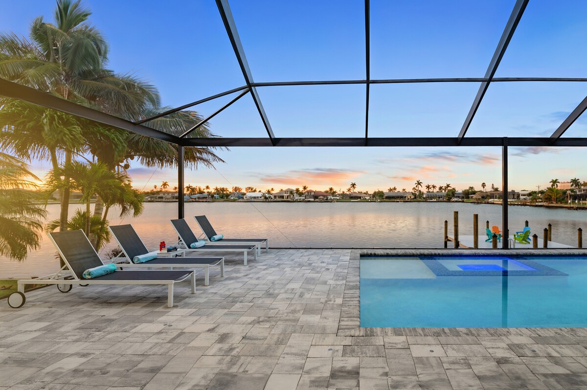 Entfliehen Sie in dieses wunderschöne Anwesen am Wasser in Cape Coral mit direktem Golfzugang, privatem Pool und Spa (im Winter beheizt). Genießen Sie ruhige Kanalblicke, einen privaten Bootsanleger und nahtloses Indoor-Outdoor-Wohnen, ideal zum Entspannen. Das Haus bietet 3 Schlafzimmer, 2,5 Bäder, eine voll ausgestattete Küche und komfortable, stilvolle Wohnbereiche. Ruhig gelegen und dennoch nah an Restaurants, Einkaufsmöglichkeiten und Waterfront-Dining—perfekt für eine erholsame Auszeit.