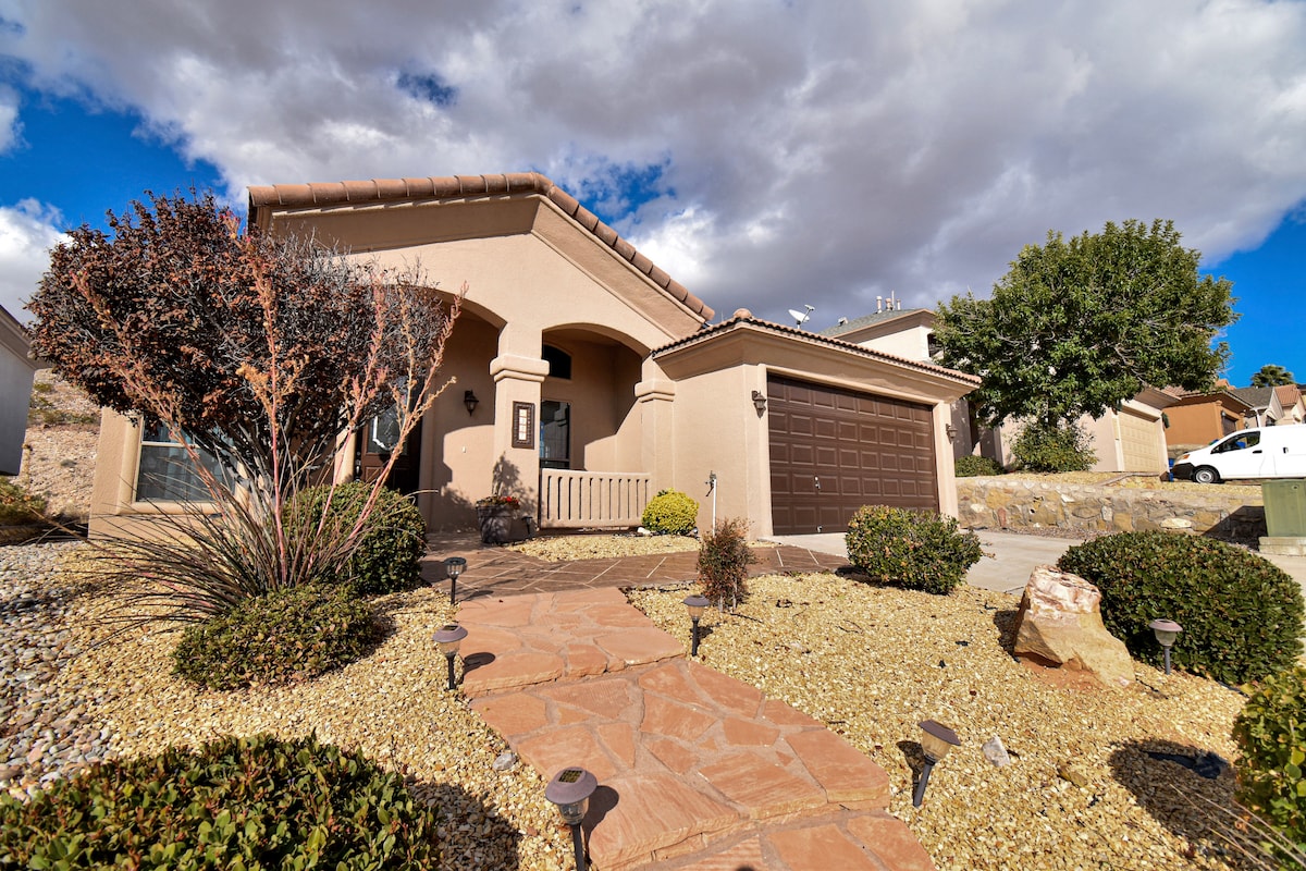Entspannen Sie sich und schalten Sie ab in diesem ruhigen und stilvollen Haus im Herzen der Westseite in El Paso Tx. Diese charmante Unterkunft befindet sich in der Nähe von Restaurants, Einkaufszentren (Outlet Mall, Sunland Park Mall), Krankenhäusern, der I-10, der Mesa Street, UTEP, dem Chihuahua Baseball Stadium, dem Walmart Supercenter und den Fitnessstudios. Es gibt einen privaten Eingang, überdachte Parkplätze, Gärten und einen schönen Pool. Wir bieten dir authentischen Komfort für Familien-, Geschäfts- oder Freizeitbesuche. Wir freuen uns auf dich.