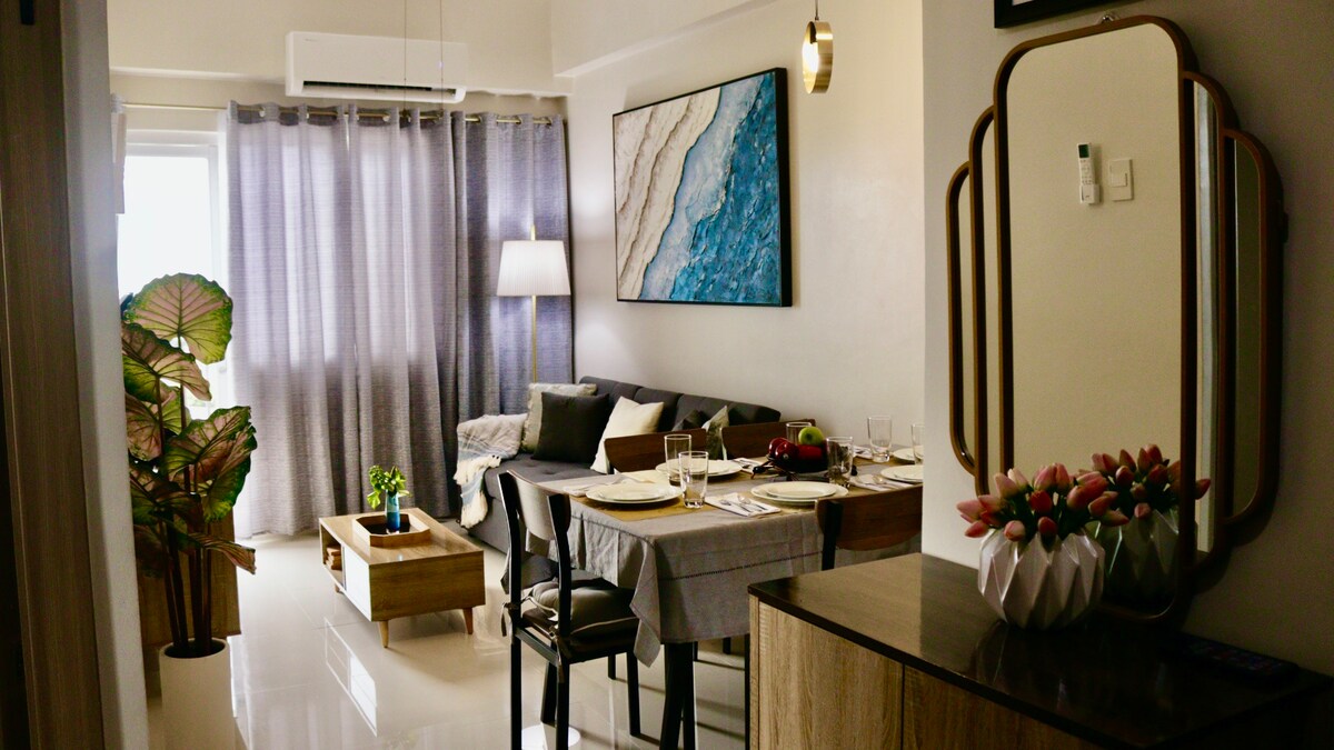This spacious (55sqm) 1 Bedroom-condo is for 5 persons . It is with very nice sea-views and located on Cebu's most famous Mactan Beach between Shangri-La and Crimson Resort. Best location right behind the new City-center of Mactan "Mactan Newtown / LG Garden) which takes only 3 minutes by Grab (more than 15 GRAB-drivers waiting nearby to get your GRAB, so it usually takes only 5-6 minutes to arrive at the Entrance / lobby) . Also very close to the airport - 17-18 minutes unless rush hours.