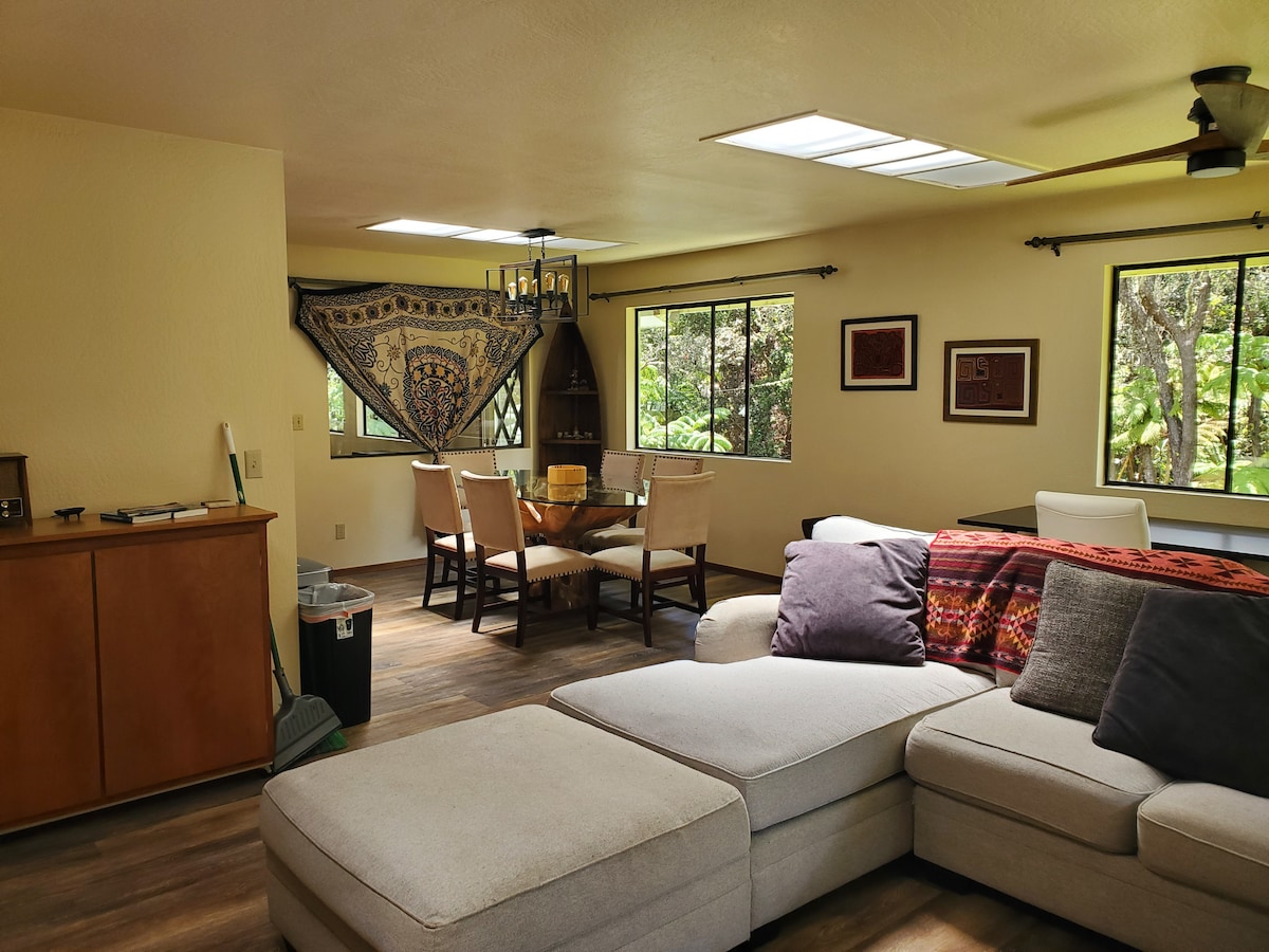 Vergiss deine Sorgen in dieser geräumigen und ruhigen Wohnung im Obergeschoss, die über ein Treppenhaus erreichbar ist. Es verfügt über drei Schlafzimmer, eine große Küche, ein gemütliches Wohnzimmer und einen zusätzlichen Wintergarten mit einem vollwertigen Bett, der durch eine Tür für Privatsphäre getrennt ist. Mit zwei Queensize-Betten, zwei Doppelbetten und einem Futon bietet sie bequem Platz für bis zu 9 Gäste. Große Fenster bieten einen Blick auf den umliegenden, einheimischen hawaiianischen Wald. Nur wenige Minuten vom Hawaiʻi Volcanoes National Park und lokalen Restaurants entfernt, ist dieser private Rückzugsort perfekt zum Entspannen.