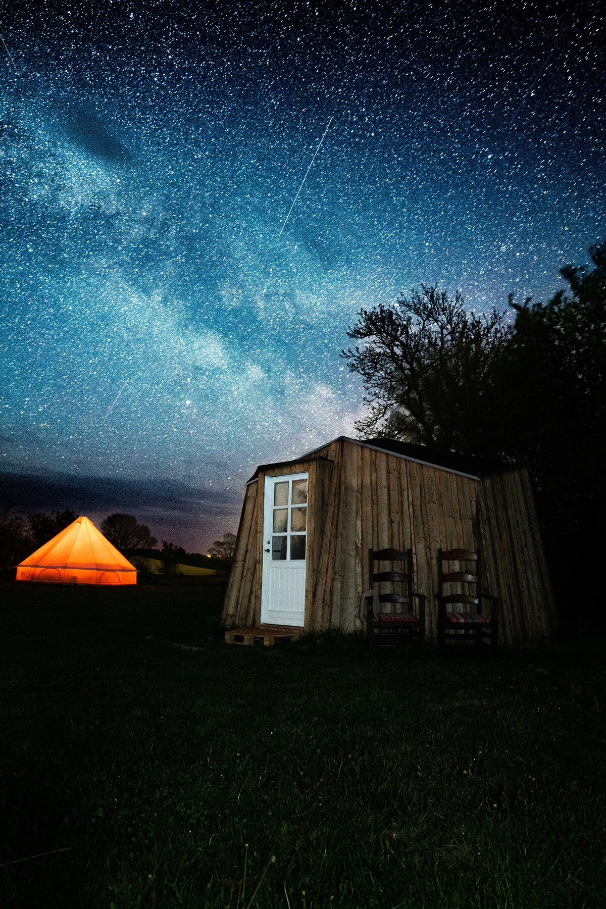 Dejligt telt med kig til stjernene gennem ovenlys vindue. God box madras 140 X 200 cm og 2 enkelt senge med skummadrasser Dyner, sengetøj og håndklæder. Stole, borde og service. Vandkoger og mulighed for at lave kaffe og the. Bade og toiletter på gården. Bålsted og mulighed for at lave mad og bål på rist . Grill og camping komfur. Sauna med koldvandskar og gode olier - 250 kr Morgenmad 120 kr Aftensmad 150 kr Lille butik på gården hvor der kan købes drikkevarer, is snacks.