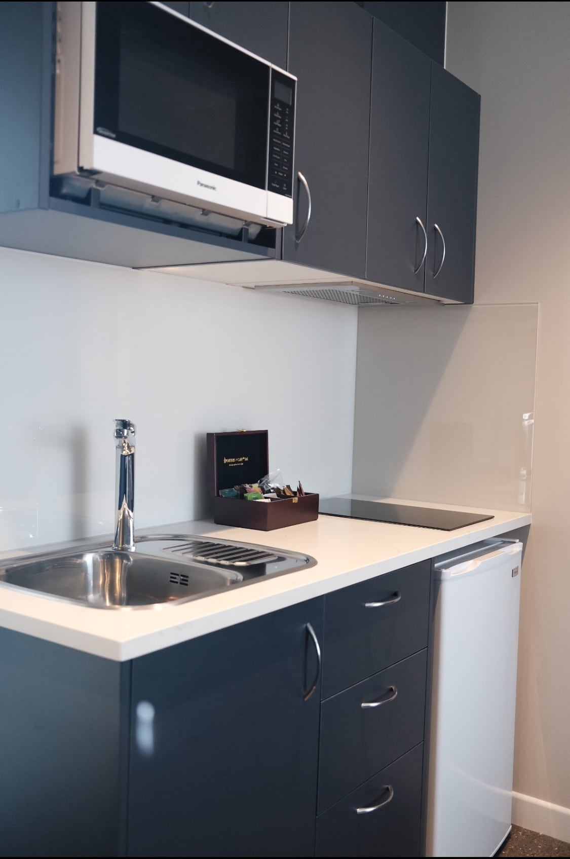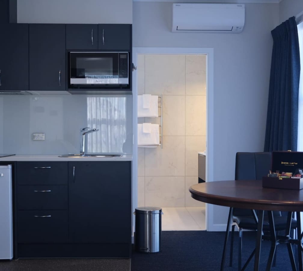 Full kitchen facilities Air conditioning and a heat pump Sky Guest Select 50+ channels High speed Wireless and broadband internet Spa bath Complimentary tea & coffee. Parking is $15.00/ car park. A Queen bed. Just a couple of minutes to around 30 restaurants on the strand. Crossing the road is BayCourt theater, City liblary, Bus stop.