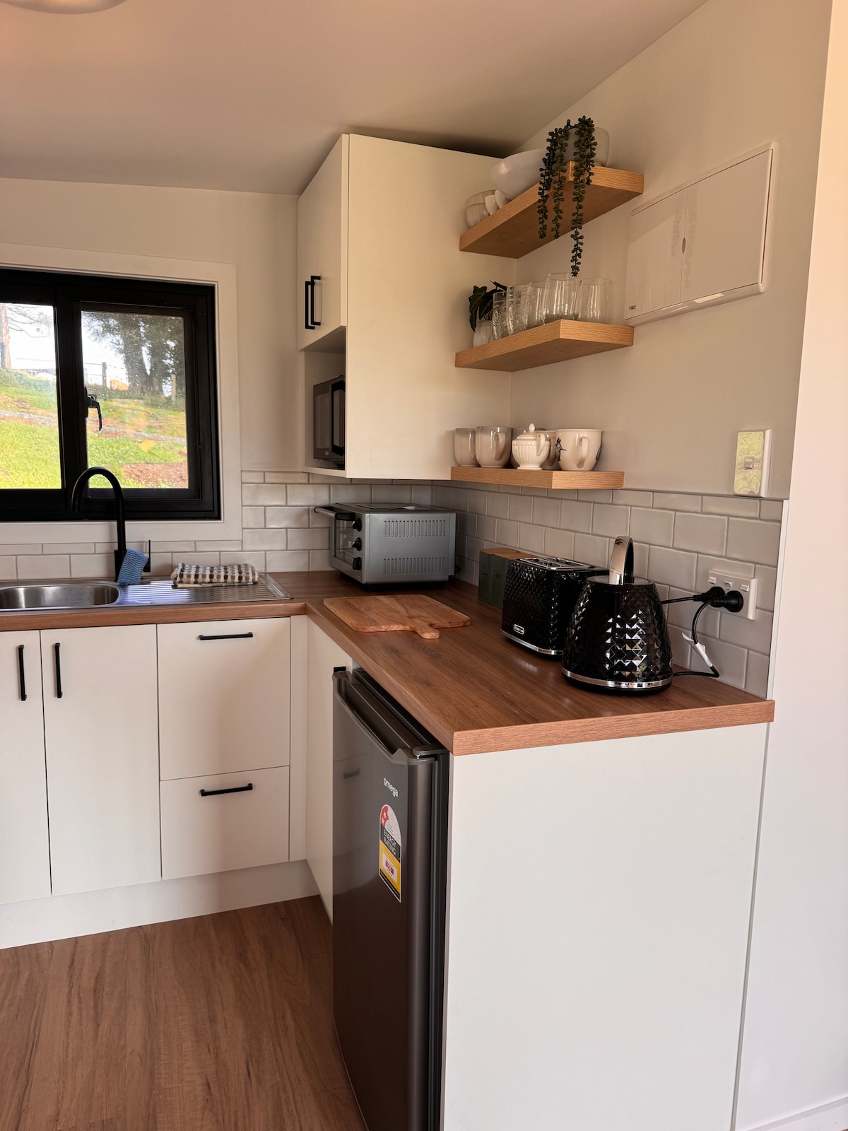 Atme die frische Landluft in diesem modernen Architektur-Refugium. Das Äußere der Unterkunft zeichnet sich durch eine elegante Industrieästhetik und ein privates Außenbad aus, während das Innere durch einen Boutique-Designstil, neutrale Grautöne und Holzakzente besticht. Die Unterkunft liegt an einer typischen neuseeländischen Landstraße. Umgeben von Milchviehbetrieben und Kiwiplantagen können Gäste die Landwirt:innen bei ihrer täglichen Arbeit beobachten. Wenn sie mit ihren Traktoren vorbeifahren, kannst du ihnen gerne zuwinken.