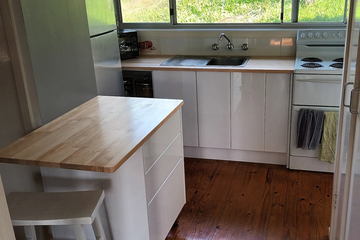 Ein Studio mit einem Sichtschutzzaun, damit du auf deiner eigenen Terrasse sitzen und deine Zeit hier im The Blue Wren Tin Shed genießen kannst. Kostenloses WLAN. Kostenloses Parken vor Ort Ein Queensize-Bett, eine Zweisitzer-Couch, ein kleiner Esstisch und Stühle, Mikrowelle, Kühlschrank, Nespresso-Kapselmaschine, Toaster, Teller, Schüsseln, Besteck. Zusätzliche Bettwäsche, Handtücher, Decken und Heizung. Wir sind immer noch dabei, unseren Traumgarten zu schaffen, sodass du mich und meinen Mann von Zeit zu Zeit im Garten sehen kannst. Wir bieten ein leichtes kontinentales Frühstück an.