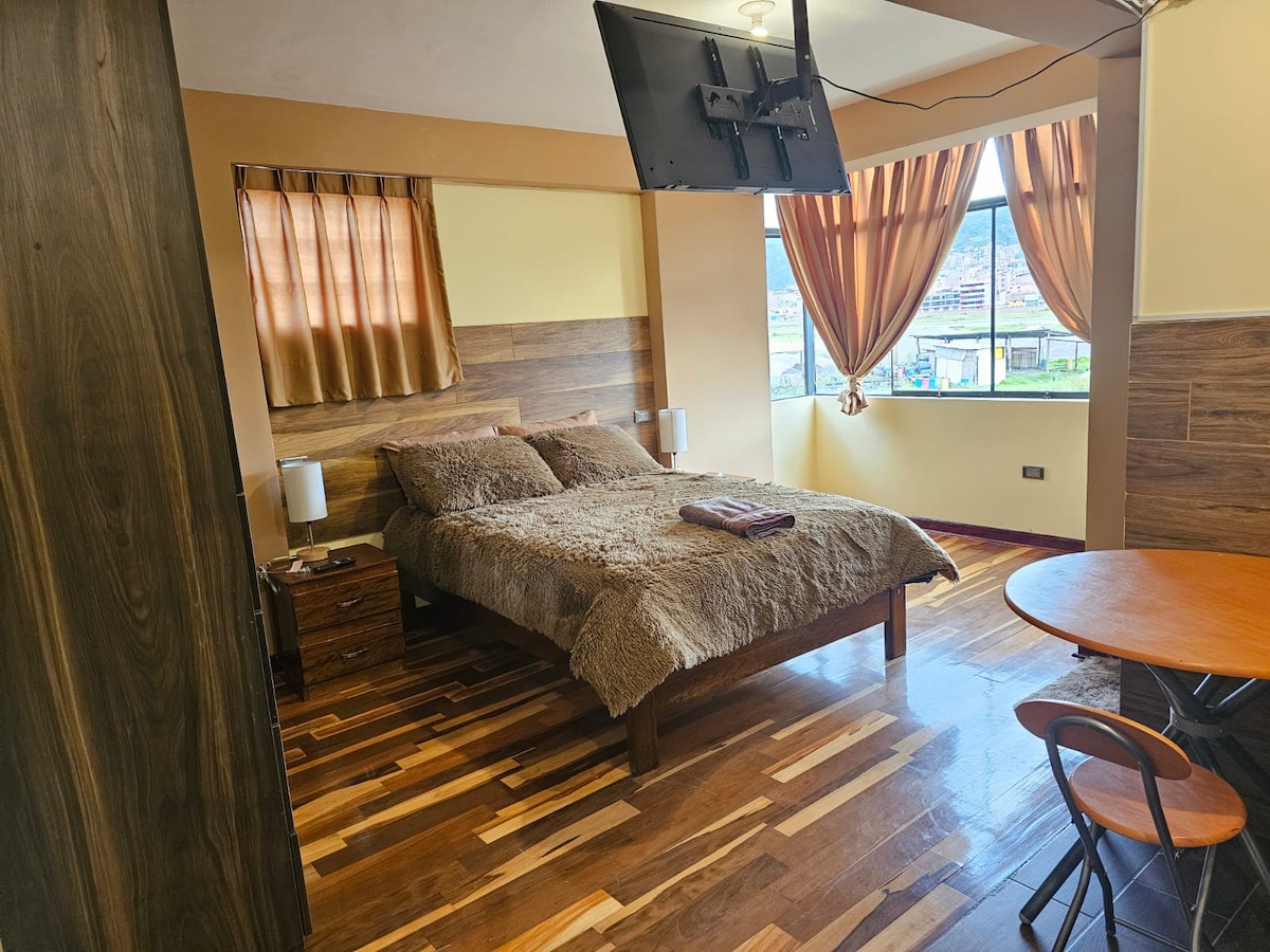 Agradable miniapartamento ubicado en cuarto piso, cuenta con baño privado, cocina, sala, escritorio, una pequeña terraza compartida y una lavandería de uso común; también cuenta con Wifi y TV y con abundante luz natural,la zona es centrica, segura y de fácil acceso, se puede llegar a la plaza de armas en 10 minutos usando taxi o en 30 minutos caminando. Cerca hay restaurantes, bancos, minimarket, farmacias, hospital y paradero de buses.