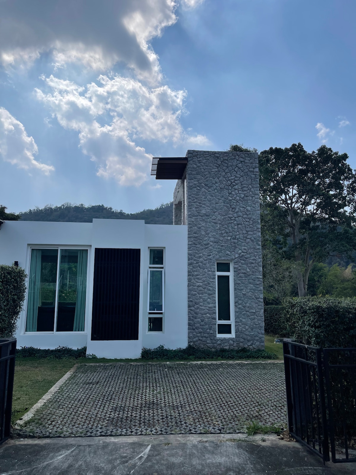 Neues Haus im zeitgenössischen Stil, in der Nähe des Khao Yai Nationalparks, einem UNESCO-Weltkulturerbe. Das Haus liegt in einer kleinen privaten Wohnsiedlung und bietet einen Blick nach Norden auf den Wald. Wenn du Glück hast, kannst du in der Abenddämmerung Tausende von Fruchtfledermäusen beobachten, die aus nahegelegenen Höhlen hervorkommen. Du kannst auch eine der 4 Arten von Nashornvögeln entdecken, die in der Gegend leben. Wilde Elefanten besuchen auch die Gegend vom Nationalpark aus.