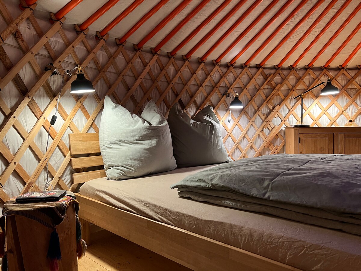 Auf einer Anhöhe, eingebettet von alten Bäumen, steht 1 von 3 unkonventionellen Hütten mit je 2 Schlafplätzen. Bei jedem Wetter (außer im Winter) kann die Hütte Campingfreunden, Fahrradfahrern oder Kurzentschlossenen eine Übernachtung, als Alternative zum Zelt, bieten. Einfach nur einen Schlafsack und ein Handtuch mit in das Gepäck. Der Komfort besteht aus, einem Dach über dem Kopf, einem Platz zum Schlafen, einem schönen Lagerfeuer und einer warmen Außendusche mit separatem WC.