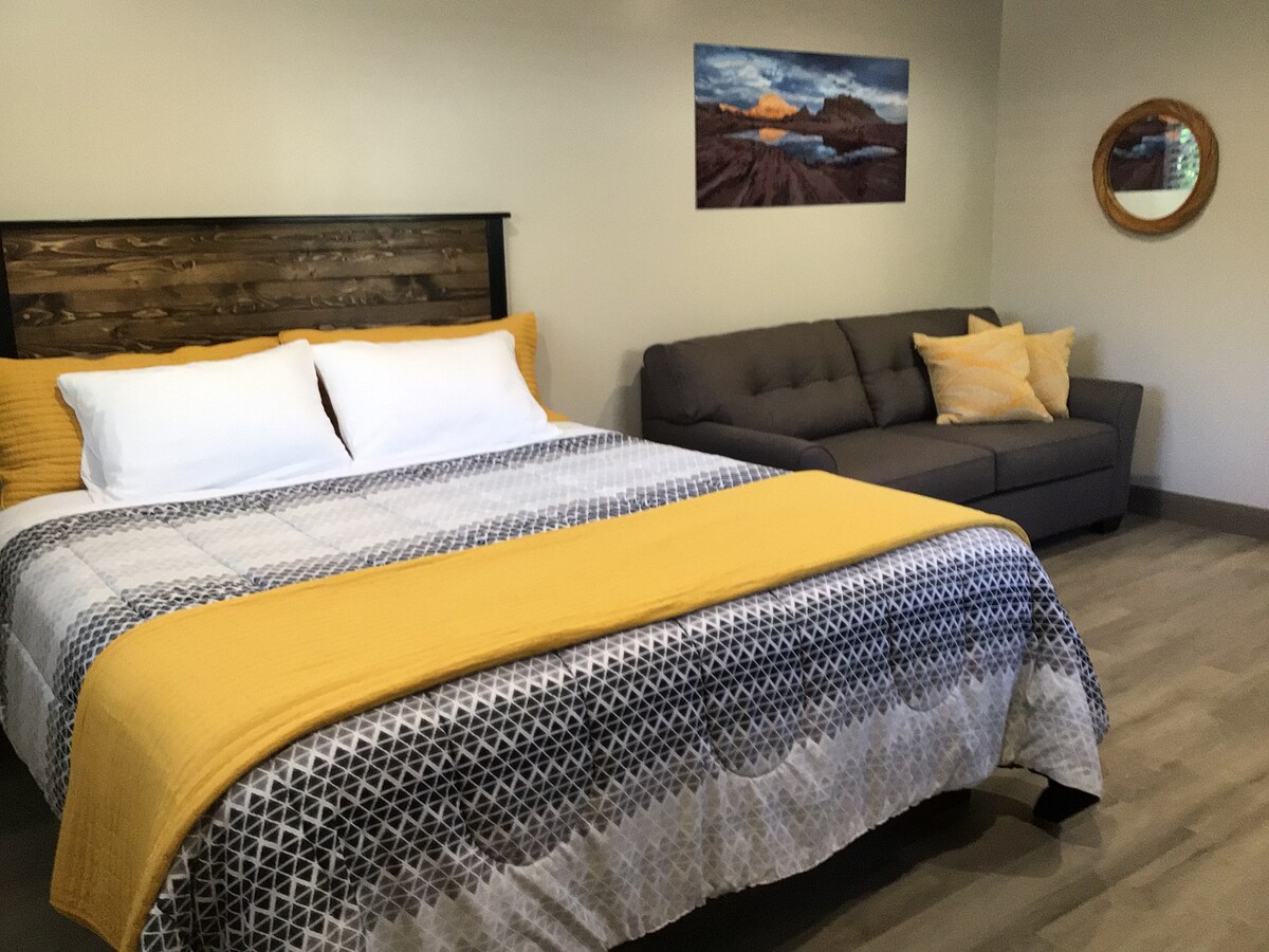Dieses Zimmer (275 Quadratfuß) mit eigenem privaten Eingang wird dich verjüngen, während du dich für einen weiteren Tag voller Spaß im südlichen UT-Gebiet ausruhst. Es verfügt über ein komfortables Queensize-Bett, einen 42-Zoll-Flachbildfernseher, DirecTV, Apple TV, ein eigenes Bad, eine Mikrowelle und einen Minikühlschrank. Dieses Zimmer ist der perfekte Ort für Spaß und Abenteuer oder einfach nur zum Entspannen. Das Hotel liegt in der Nähe von Snow Canyon, Rocky Vista University und Tuacahn mit Wandern, Radfahren, Kunst, Senior Games in Utah, St. George Marathon und dem Ironman zum Genießen.