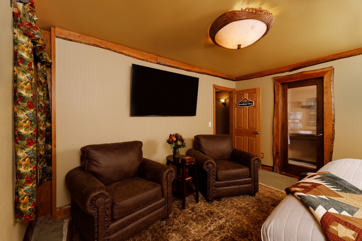 This room features beautiful live-edge woods and boasts a 300 square foot private deck nestling in the trees overlooking our premier wildlife viewing area. The second story location makes viewing even more spectacular. The king-size bed and large comfy chairs make inside as attractive as outside. Slip into your custom tiled walk-in rain shower in your private bathroom with heated flooring and a local artisan ceramic sink and live edge vanity. Also you have an in-floor safe for your convenience.