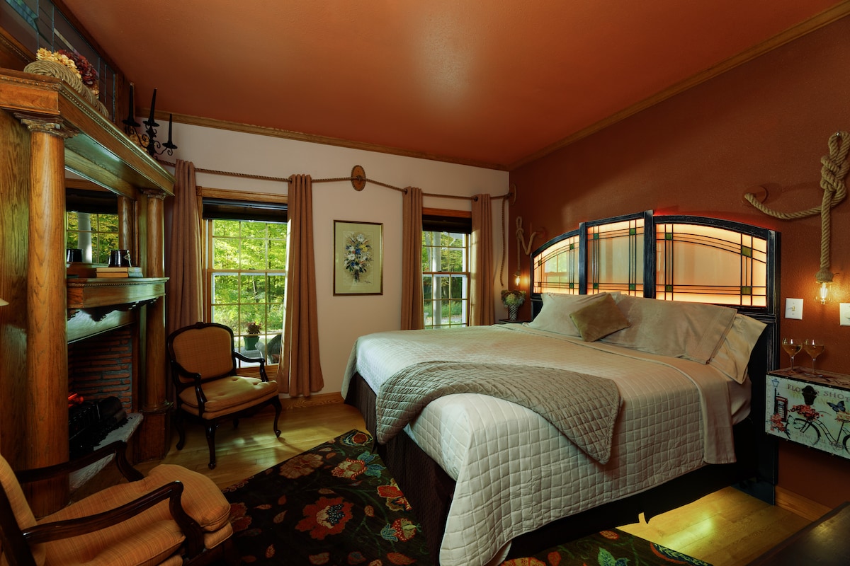 Dieses Zimmer bietet eine romantische Whirlpool-Badewanne für zwei Personen und eine separate große geflieste Glasblockdusche in einem geräumigen Badezimmer mit einer atemberaubenden 18-Fuß-Decke. Die Romantik geht weiter mit einem schwimmenden Bett und einem wunderschön bunten Glaskopfteil auf dem Kingsize-Bett mit weicher Auflage. Ein antiker Mantel ziert die Wand neben dem Torbogen zu deinem privaten Bad und zwei Stühle sitzen neben deinem glühenden Kamin. Du kannst dich entscheiden, die Stimmungsbeleuchtung oder reichlich natürliches Licht zu genießen.
