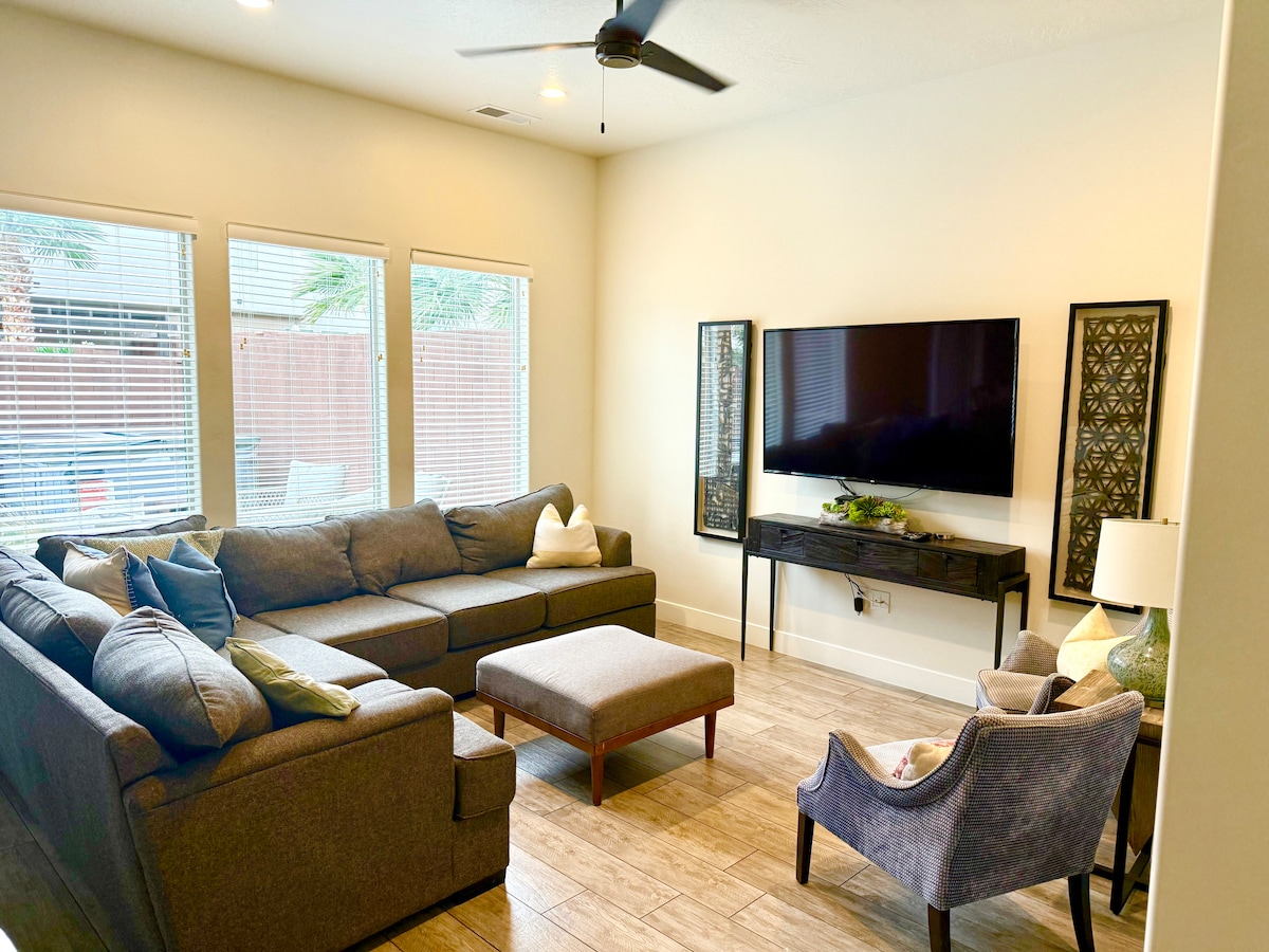 Verliebe dich in diese wunderschöne Ferienwohnung außerhalb von St. George! Lehne dich zurück und entspanne dich in diesem geräumigen Haus mit 3 Schlafzimmern, 3 Badezimmern, einer voll ausgestatteten Küche und einem Spielzimmer mit einem Airhockey-Tisch! Genieße entspannende Nächte rund um die Gasfeuerstelle direkt auf der Terrasse mit deinen Lieben. Ausgezeichnete Lage für deine Basis, um eine Reise zum Zion National Park zu planen oder im Quail Creek State Park Boot zu fahren! Das nächste Abenteuer ist nur einen Schritt entfernt!