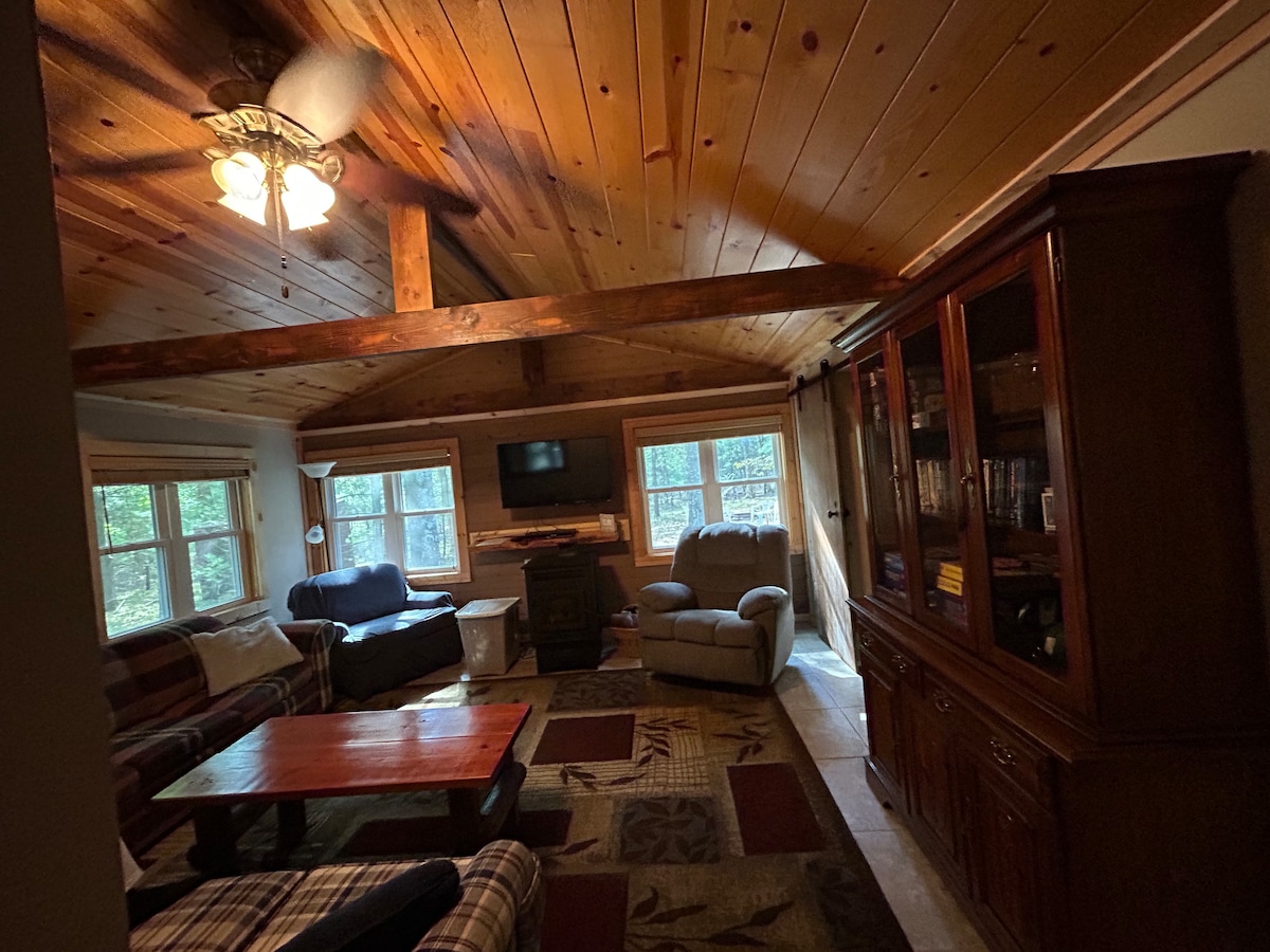 Welcome to the CABIN! Set in a 10 acre stand of secluded whispering pines that offers walking trails, fire pit, stargazing deck & wrap around covered porch to enjoy warm summer days outdoors. Welcome inside with woodstove & knotty pine cathedral ceilings that create a cozy & inviting space. Featuring a large country kitchen w/ island & fully stocked coffee bar along with modern comforts like WiFi, air conditioning & smart TVs that blend seamlessly with the cabin's rustic charm. Free EV charging