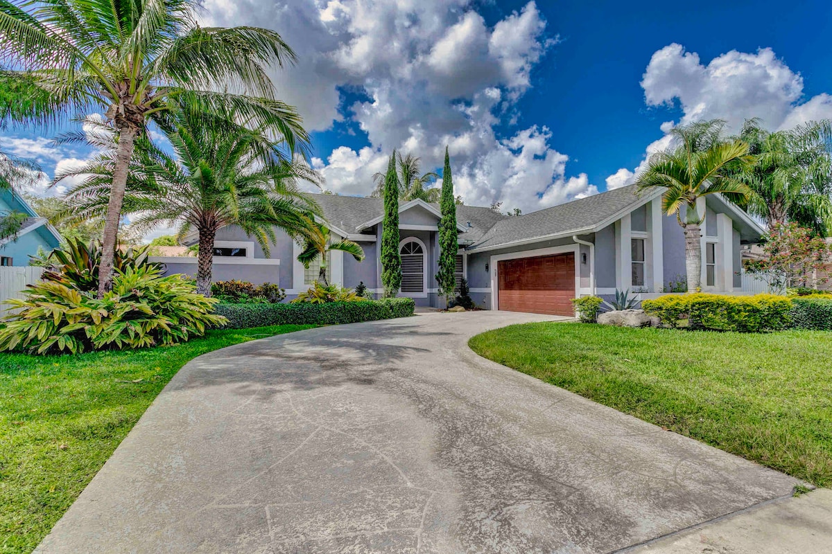 Gemütliches und ruhiges Familienhaus , eingebettet in einen schönen Garten, ist dieses komfortable Haus mit 4 Schlafzimmern die einzige Wahl für deinen Familienurlaub! Genieße den geräumigen Garten, tauche ein in den warmen Pool und genieße die herrliche Aussicht auf den Garten. Auf dem Grundstück gibt es auch Platz für Boots-/Wohnmobil-Parkplätze. Dieses Haus befindet sich im Zentrum von Wellington, Florida, 3 Minuten vom WEF entfernt.