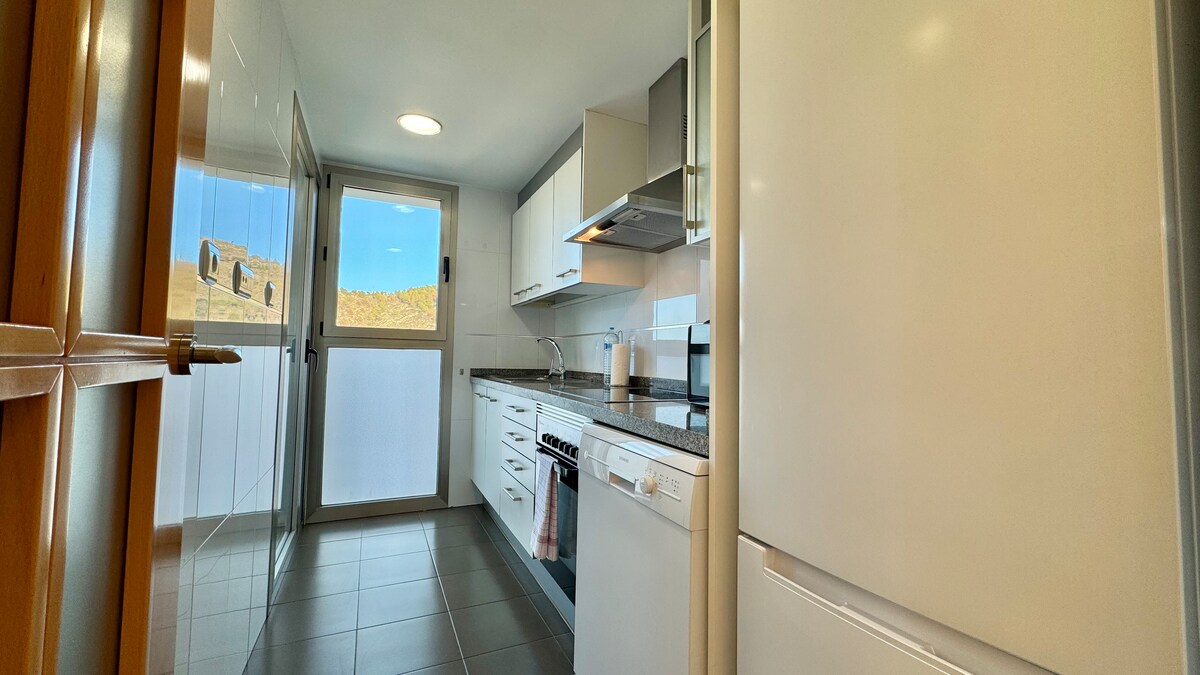 Die Unterkunft befindet sich im 24. Stock, nur wenige Gehminuten vom Strand entfernt. Es verfügt über zwei Schlafzimmer: ein Hauptschlafzimmer mit eigenem Bad und Panoramablick auf das Meer und ein zweites Schlafzimmer mit Bergblick. Es gibt auch eine geräumige Terrasse mit herrlichem Meerblick. Auf der 26. Etage findest du einen Pool mit Panoramablick auf das Meer, eine Sauna und einen Fitnessraum. Im Außenbereich erwarten dich zwei Swimmingpools, Whirlpools, ein Multisportplatz, ein Kinderspielplatz und Padel-Plätze.