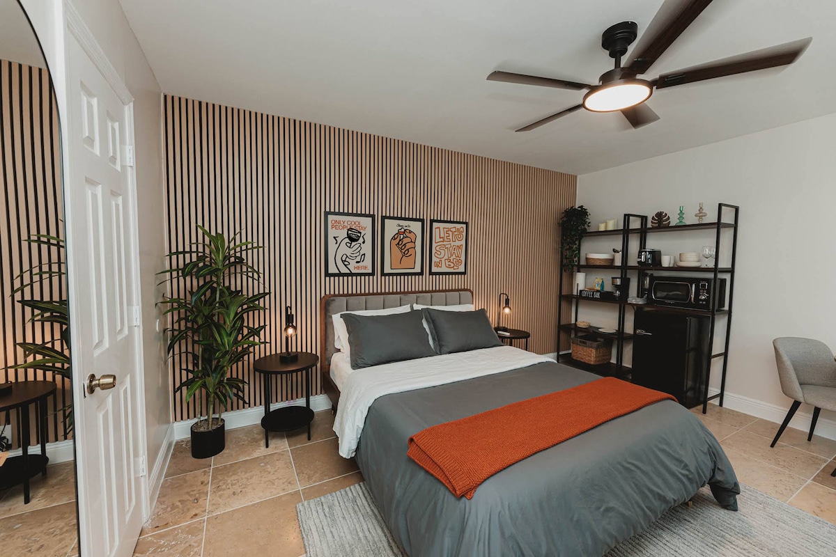 Willkommen im @The Gables Hideout, unserem schönen Studio-Gästehaus in einer ruhigen und sicheren Gegend am Stadtrand von Coral Gables. Ausgestattet mit einem eigenen privaten Eingang, einem kostenlosen eigenen Parkplatz, einer eigenen privaten Außenterrasse mit einem Grill und einem Sitzbereich, einem 24-Stunden-Check-in, einem begehbaren Kleiderschrank, einem Flachbild-Smart-TV, einer voll ausgestatteten privaten Küche und Highspeed-WLAN.