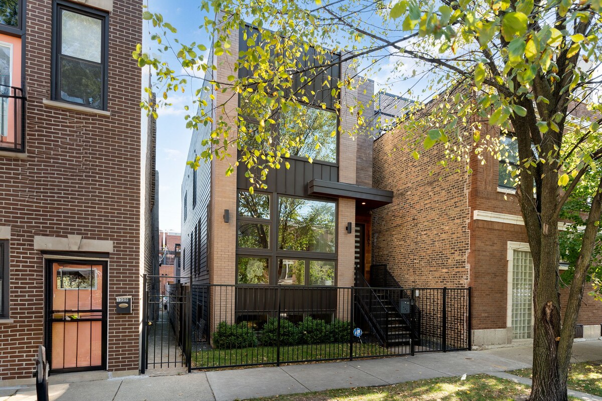 **BITTE LIES DIR DIE VOLLSTÄNDIGE BESCHREIBUNG UNTEN DURCH UND KLICKE AUF „GASTGEBER KONTAKTIEREN“, BEVOR DU EINE BUCHUNG ANFORDERST** Urbanes Designer-Haus in der Innenstadt in der Nähe der U-Bahn Blue Line (direkt zum Loop oder O'hare), Salt Shed Theater, Michigan Ave.United Center und Nachtleben. Perfekt für Familien, Geschäftsgruppen oder moderne Reisende, die mehr als 12 Personen beherbergen können. Geräumige Maisonette-Wohnung mit riesiger Terrasse im trendigen, zentralen Viertel River West. Zu Fuß zu Restaurants, Cafés, Nachtleben. 2 U-Bahn-Stationen zum Loop, 40 Minuten direkt zu den Flughäfen. Parkplätze verfügbar!