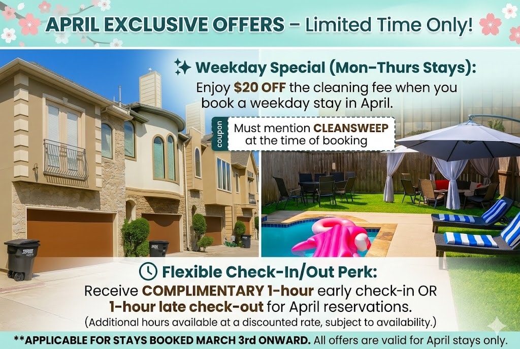 Willkommen in deinem zweiten Zuhause! Dieser moderne Rückzugsort aus der Mitte des Jahrhunderts mit 3 Schlafzimmern und 2 Bädern verbindet Stil, Komfort und Bequemlichkeit im Herzen von Houston. Egal, ob du für Familienzeit, Geschäftsreisen oder einen Wochenendausflug zu Besuch bist, du bist nur wenige Minuten von den wichtigsten Sehenswürdigkeiten der Stadt entfernt und genießt einen Raum, der für Entspannung ausgelegt ist.