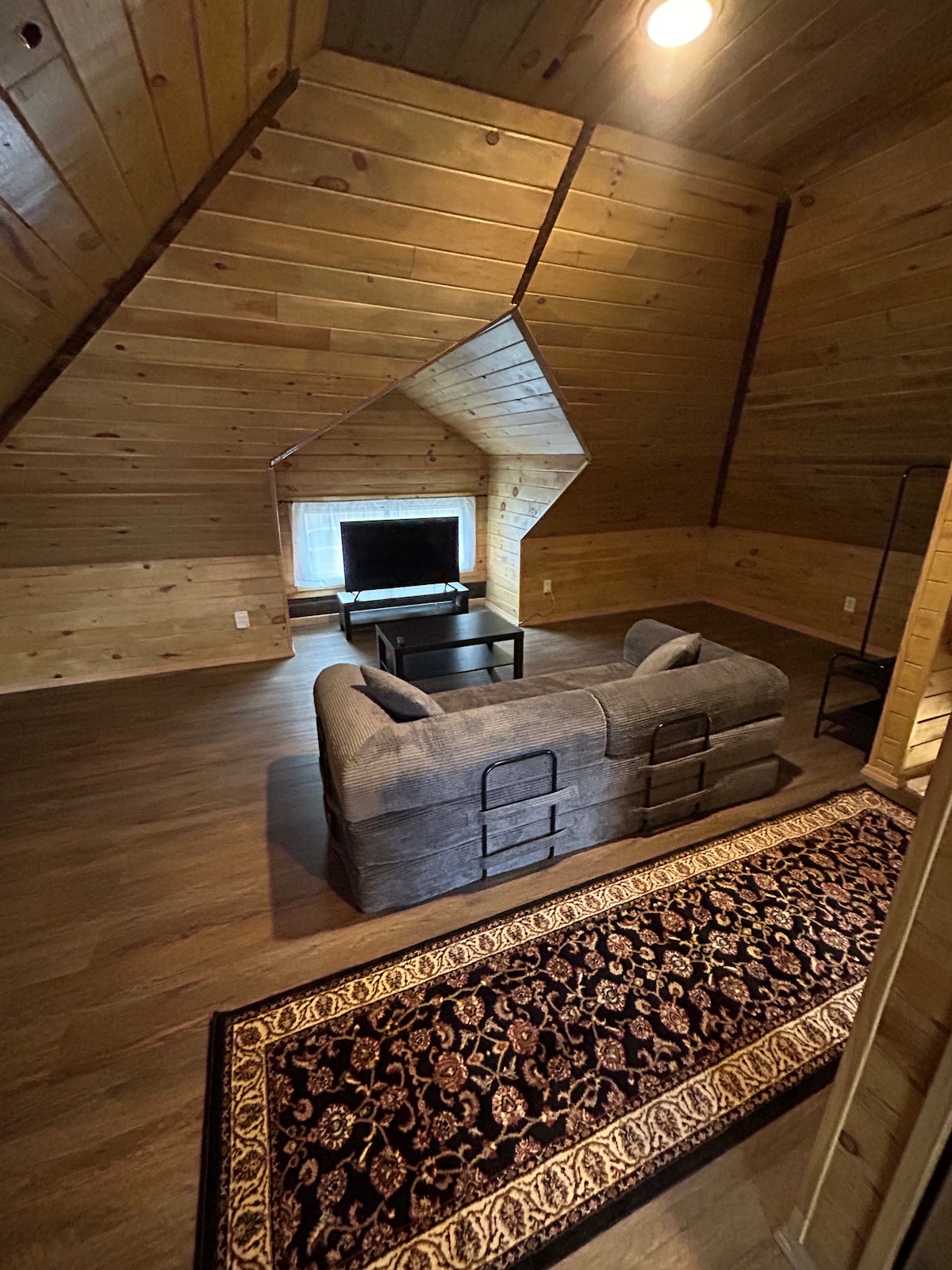 The space cultivates both modern and cabin living. Step into an inviting retreat featuring natural wood accents, modern furnishings, and plenty of sunlight streaming through oversized windows. The open-concept layout includes a cozy living area, a well-equipped kitchenette, and a comfortable queen bed designed for rest and relaxation. This is a loft style apartment so many of the ceilings and twists/turns of the unit are narrow and mini. This unit many not be ideal for taller individuals.