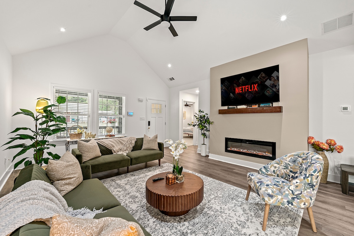 Wenn du in dieser Unterkunft in der Innenstadt von Cartersville übernachtest, hat deine Familie alle wichtigen Anlaufpunkte ganz in der Nähe. Gehe zu Fuß zu allen Geschäften und Restaurants in der Innenstadt. Entspanne dich morgens bei einer Tasse Kaffee auf der angeschlossenen, abgeschirmten Veranda. Geräumiger Parkplatz hinter dem Haus, der privat und sicher ist. Familienfreundliche Einrichtung mit einer riesigen Couch, die sich in ein Queensize-Bett mit allen benötigten Bettwäsche und Kissen ausziehen lässt. Kaffeebar-Setup, dedizierter Arbeitsbereich mit Drucker, drahtlosem WLAN und Fernsehern in jedem Zimmer.