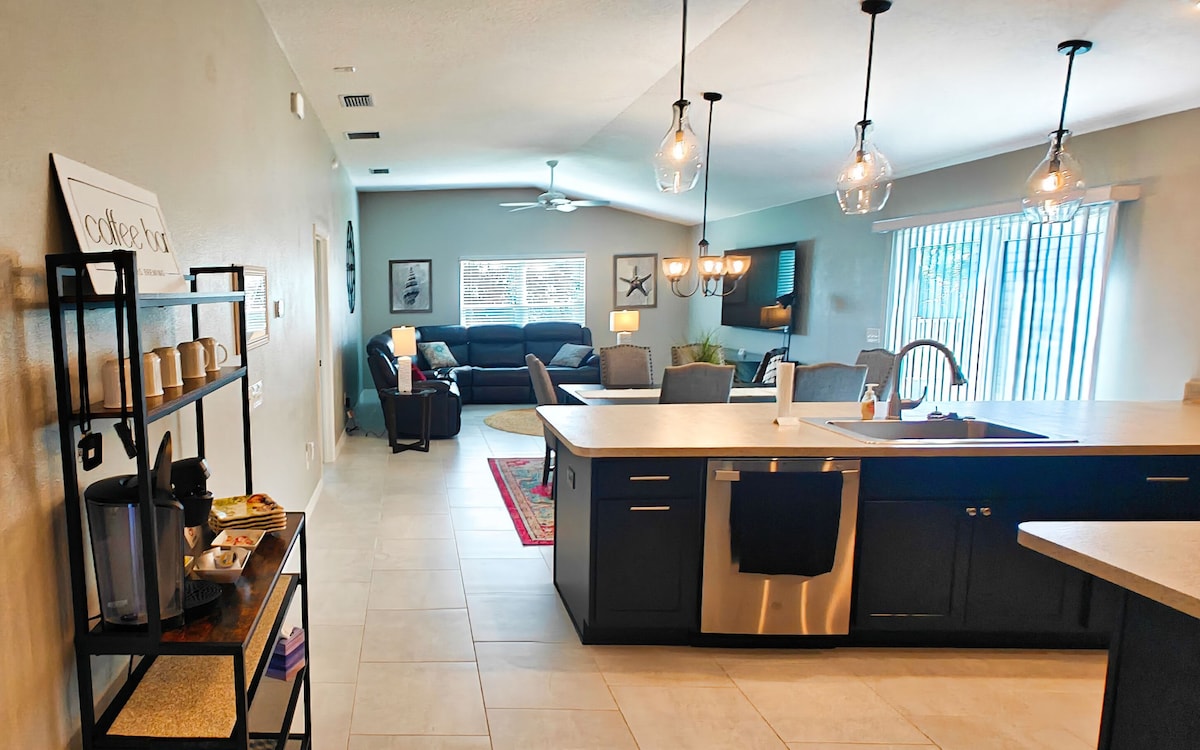 Entfliehe in dieses atemberaubende Moonstone-Haus in der Nähe des Eastport Square, von Publix und des Fenney Rec Centers. Genieße Naturpfade, Pools, den Fenney Grill und den Executive-Golfplatz, die alle bequem mit dem Golfcart zu erreichen sind. Entspanne dich auf der privaten Veranda, koche in der großen Küche und genieße stilvollen Komfort in einer friedlichen Umgebung. Erlebe SpaceX-Raketenstarts von der Terrasse aus. Golfcart für 25 Dollar/Tag oder 350 Dollar/Monat verfügbar.
