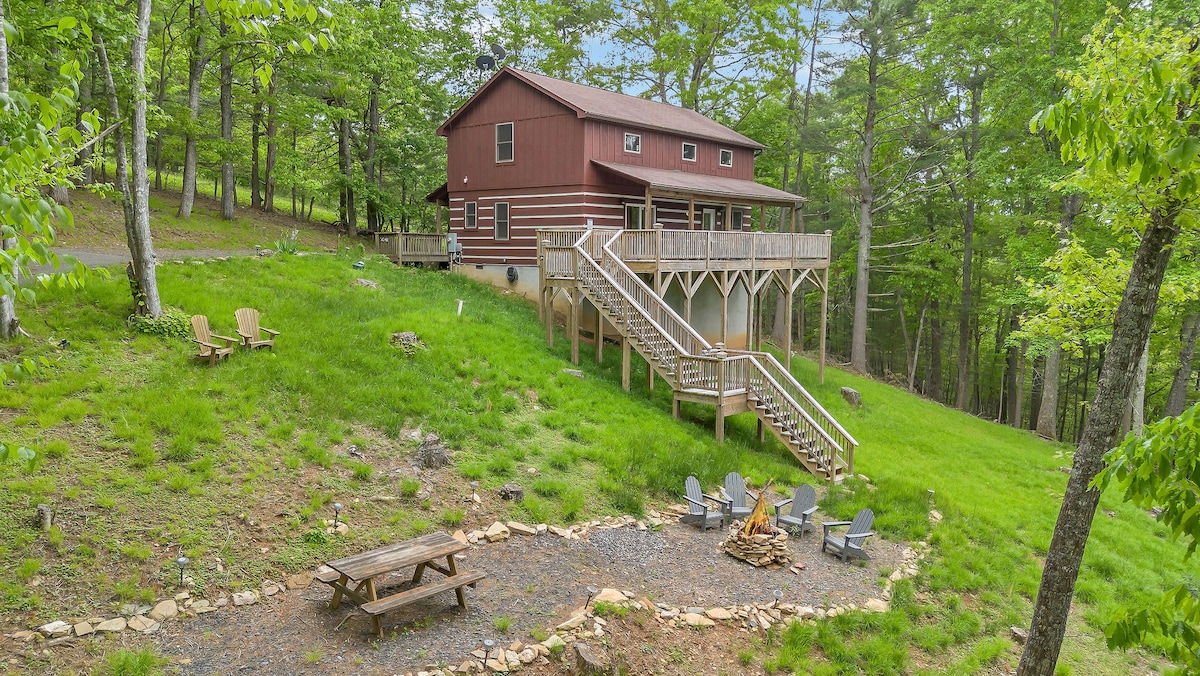 Look no further...lift your eyes up to the mountains in this beautiful retreat. The views are breathtaking from every angle! Relax in the hot tub, roast marshmallows, walk the mountain trails, play cornhole, or watch the sunset or birds from the spacious desks. If it is rainy make music on the guitar, cook with abundant supplies, or watch films/play games on a 85” TV. You will find this fabulous retreat at the end of a windy road at the top of the Buck Mountain private gated community.