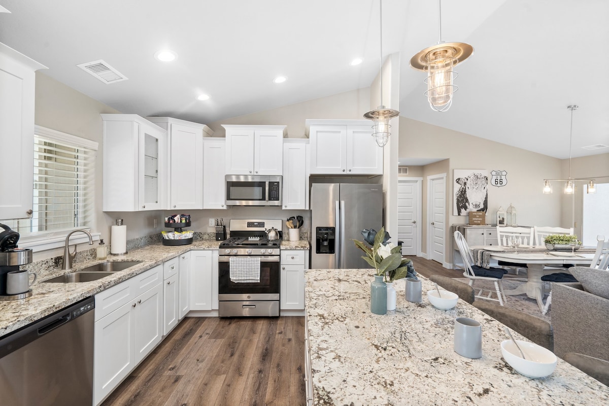 Übernachte in diesem stilvollen, brandneuen Haus, in dem du mit deinem Dirtbike oder Geländefahrzeug von unserer Einfahrt zum Kaibab National Forest (ca. 0,5 Meilen entfernt) fahren, zum See auf der anderen Straßenseite gehen kannst, der einen Park und Spielplatz hat, oder deine Golfschläger mitbringen und den Tag auf dem Elephant Rocks Golf Course verbringen kannst! Wir haben eine Kaffeebar, eine voll ausgestattete Küche, einen Grill, eine Waschmaschine und einen Trockner sowie einen Garagenzugang. Wir sind ein paar Minuten von der Innenstadt von Williams, eine Stunde vom Grand Canyon National Park South Rim und 90 Minuten von Sedona entfernt.
