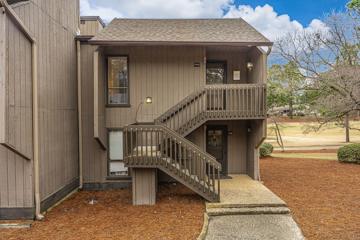Renovierte, zentral gelegene Wohnung in Pinehurst – nur 10 Gehminuten vom Pinehurst Golf Clubhouse entfernt! „Long Drive On No. 5“ ist eine neu renovierte Einzimmerwohnung im zweiten Stock, die sich perfekt am Loch Nr. 16 von Pinehurst No. 5 Golfplatz. Entspanne dich auf der privaten hinteren Terrasse mit freiem Blick auf das Fairway und genieße den Sonnenschein und die unvergleichliche Ruhe. Gemütliche und luxuriöse Oberflächen in Kombination mit einer ausgezeichneten Lage machen diese Wohnung perfekt für einen Wochenend-Golfurlaub oder einen längeren Aufenthalt!