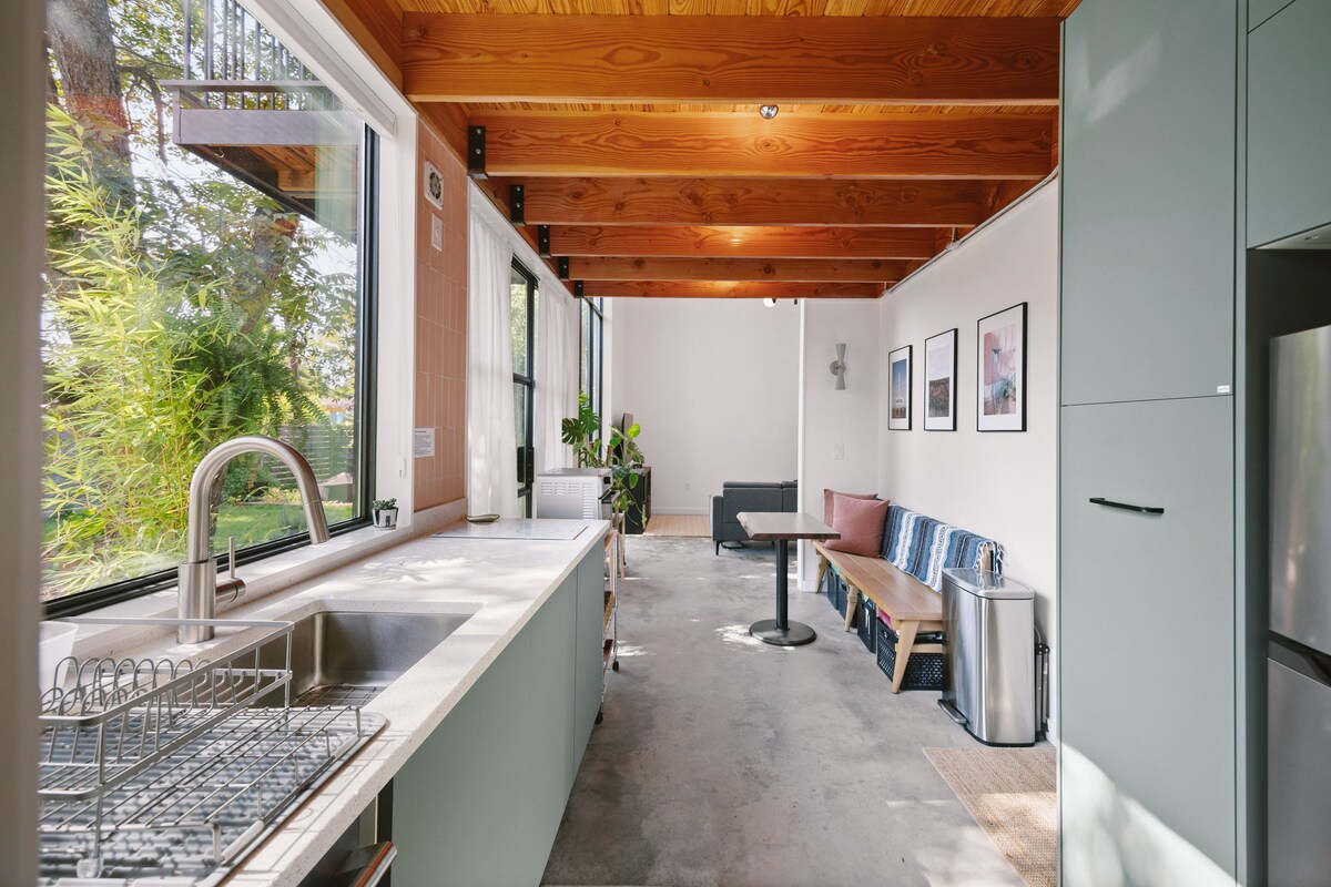 Willkommen in der Casita de Meador, einer privaten 289 Quadratfuß großen Pension, die einen gehobenen, entspannten Aufenthalt in Austin bietet. Ruhe dich in einem luxuriösen Kingsize-Bett mit luxuriöser Bettwäsche aus. Koche oder wärme deine Lieblingsgerichte in einer gut ausgestatteten Küchenzeile auf. Beginne deinen Morgen mit kostenlosem Nespresso-Kaffee, Tee und Leckereien. Mach es dir mit werbefreiem Streaming, schnellem WLAN, einer Regendusche, unbegrenztem heißen Wasser und einer Waschmaschine und einem Trockner in der Unterkunft gemütlich. Gut gelegen für einen schnellen Zugang zur Innenstadt von Austin, UT, Q2 Stadium, ABIA und der Domain.