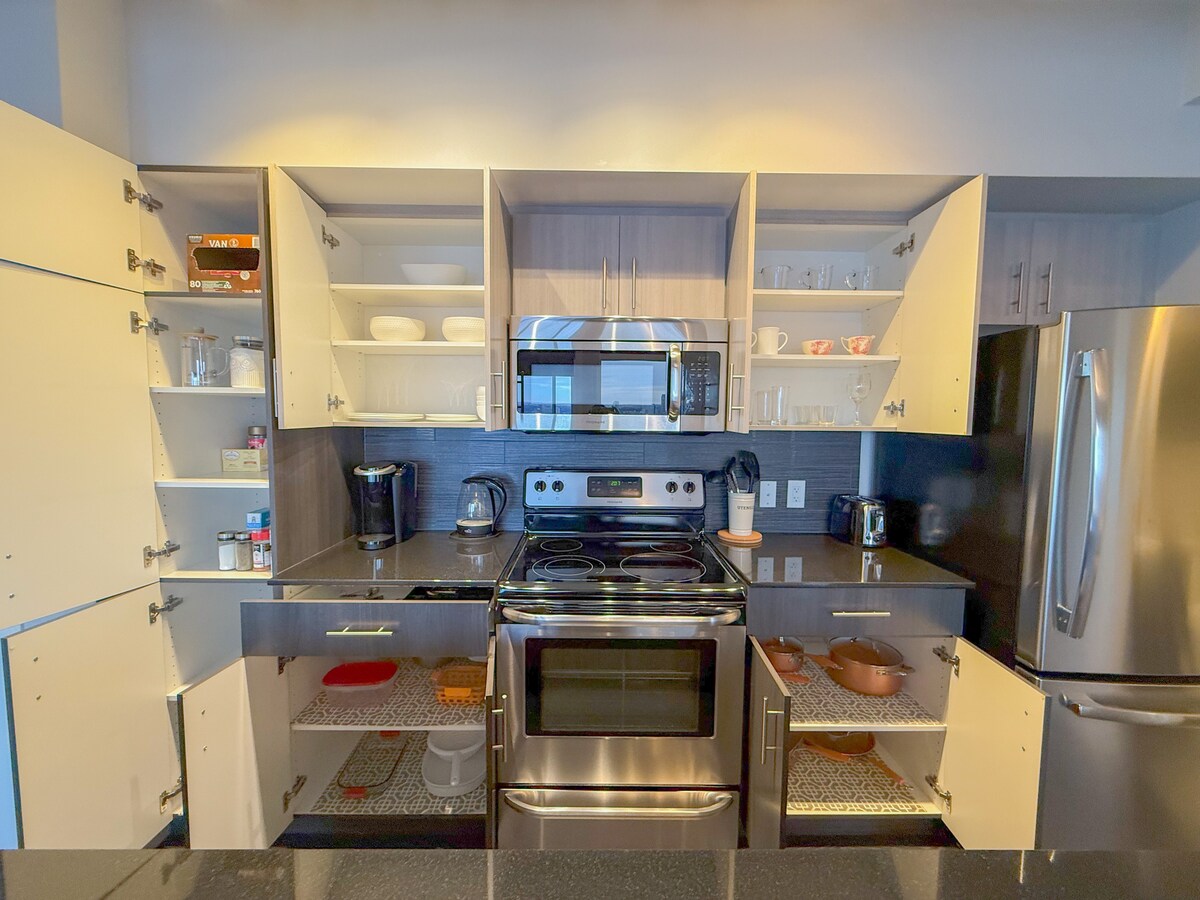 Professionell verwaltet von We Host Inc. - PRIME LOCATION: Downtown Edmonton, nur wenige Schritte von Rogers Place, YMCA & U of A - Neu renoviertes Luxus-Loft mit modernen Möbeln - 2 Schlafzimmer mit Kingsize-Bett | Terrasse - Voll ausgestattete Küche mit Granit-Arbeitsplatten und Edelstahl-Geräten - Klimaanlage und Waschmaschine in der Unterkunft - Privater Garagenparkplatz für 1 Fahrzeug (passt für normales Auto) - In der Nähe von Top-Restaurants, Cafés und dem Sommer-Bauernmarkt