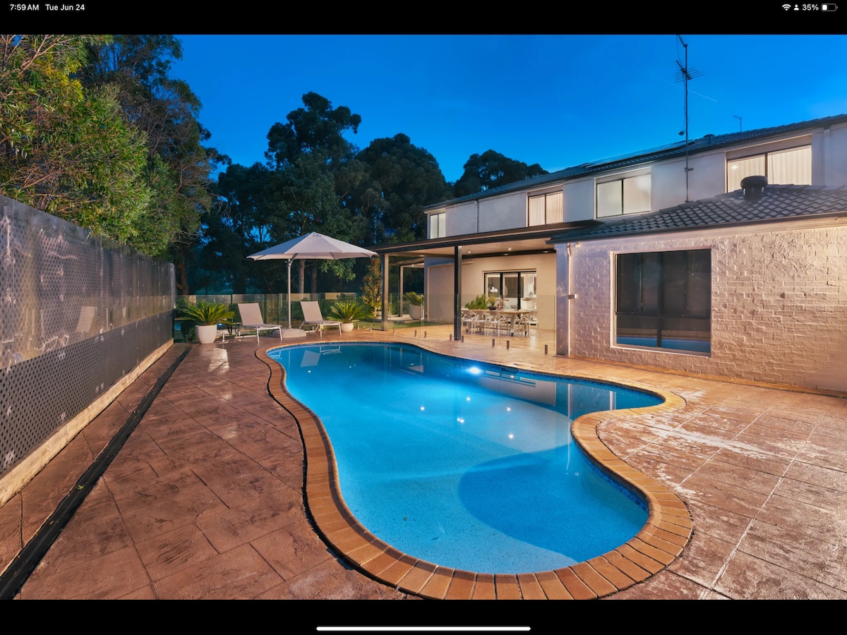 Somerset Manor Grandeur Millionaire Home, zwei Wohnbereiche Geräumiges, exquisit eingerichtetes, luxuriöses, voll ausgestattetes zweites Zuhause. Qualitätsbetten - Tempur-Matratze, Qualitätsmöbel, schnelles 5G-WLAN, Netflix, 15 Minuten Fahrt nach Penrith, Base of Blue Mountains, Arbeitsaufenthalt, Familienaufenthalt, Auslandsaufenthalt. Überdachte Unterhaltungsbereiche, Holzkamin, Daikon-Klimaanlage, neuer Weber-Grill, Hot Spa Vortex Hydrotheraphie. Einfache Fahrt zum Sydney CBD & Blue Mountains, brillante Lage, um Sydney zu besuchen. AIRBNB LUX