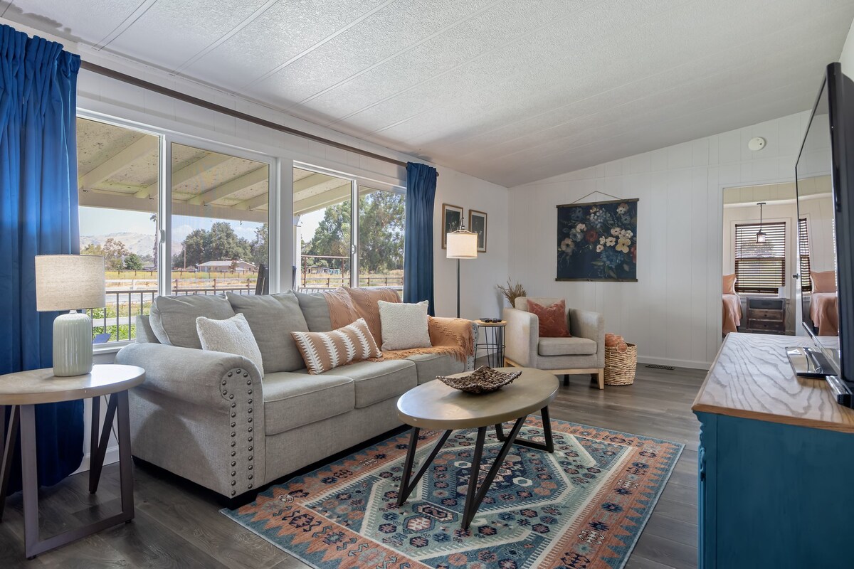 Modernes Design-Studio mit Bergblick in Three Rivers, nur wenige Minuten vom Sequoia National Park entfernt, mit einer privaten Terrasse in einer ruhigen natürlichen Umgebung. Diese durchdacht gestaltete, moderne kalifornische Hütte bietet einen malerischen Blick auf die Sierra-Vorgebirge, reichlich natürliches Licht und eine ruhige, private Atmosphäre – ideal für einen ruhigen Rückzugsort in der Nähe von Wanderwegen, Flüssen und dem Parkeingang. Das neu erbaute Studio verfügt über eine individuelle Küchenzeile mit Stein-Arbeitsplatten, kuratierte Möbel und eine Kunst- und Büchersammlung.