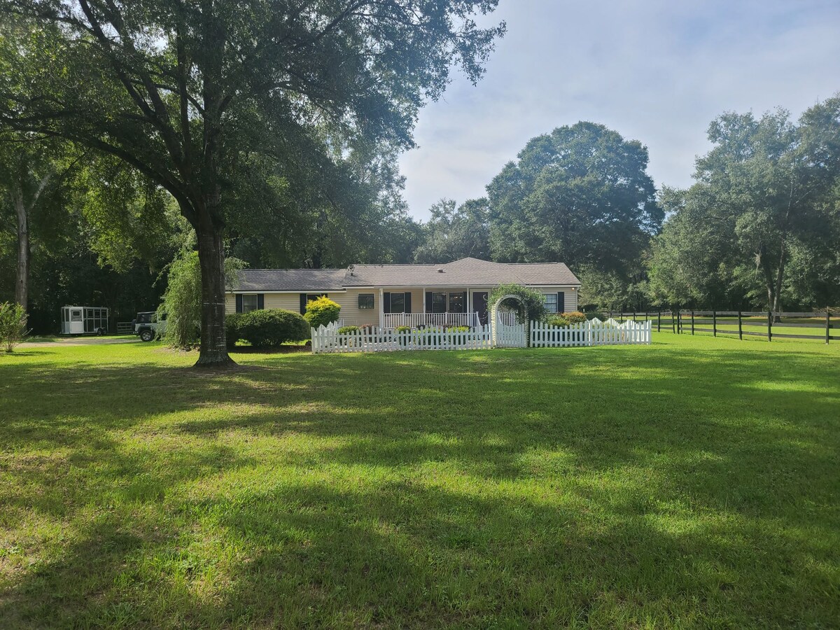 Erlebe die Gelassenheit, auf einer Pferdefarm aufzuwachen, während du nur wenige Minuten von wichtigen Sehenswürdigkeiten wie dem World Equestrian Center (4 Meilen), dem Silver Springs State Park (12 Meilen) und einer Vielzahl anderer natürlicher und unterhaltsamer Sehenswürdigkeiten entfernt bist. Dieses 521 Quadratfuß große Ferienhaus wurde 2021 erbaut und verfügt über den Komfort und die Annehmlichkeiten, die du in deinem eigenen Zuhause hast. Entspanne dich inmitten der Eichen und der umliegenden Pferdeweiden …oder bringe dein eigenes Pferd mit, um es auf einer privaten Weide außerhalb des Ferienhauses unterzubringen (extra).