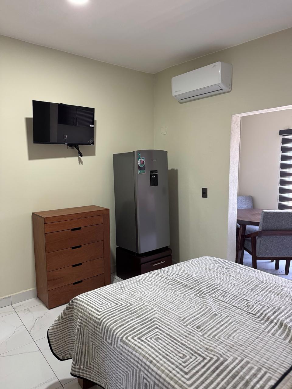 Genieße diese Unterkunft mit einer ausgezeichneten Lage, nur wenige Blocks vom Boulevard Tepic-Xalisco entfernt, in der Nähe der UAN, Krankenhäuser, Parque la Loma. (4 Min.🚗) 🌳 KOSTENLOSES NETFLIX UND PRIMEVIDEO 🤩 🍿 🎥 Ein-Zimmer-Wohnung mit einem Queensize-Bett, Klimaanlage❄️, einem Arbeitstisch, einem Schlafsofa, einem Esszimmer und einer Küche, die mit allen notwendigen Utensilien ausgestattet ist.