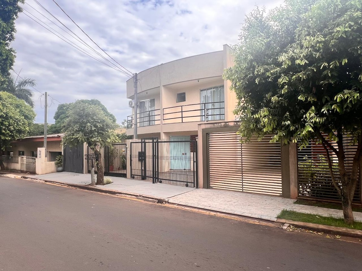 Genieße deinen Aufenthalt in Goioerê, in einem Haus in einem ruhigen Viertel. Das Schlafzimmer verfügt über ein Doppelbett, eine Split-Klimaanlage, einen Kleiderschrank und Sessel. In der Küche haben wir einen Side-by-Side-Kühlschrank, ein Kochfeld, ein Spülbecken, eine Mikrowelle, eine Arbeitsplatte, einen Tisch, einen Stuhl und Utensilien für den täglichen Gebrauch. Im Wohnzimmer befindet sich ein geräumiges Sofa mit einer Verkleidung und einem Smart-TV.