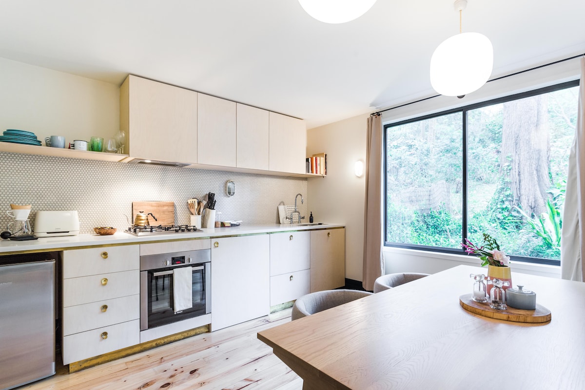 Jacky Winter Gardens – Moderne, künstlerische Hütte in der Nähe von Creek