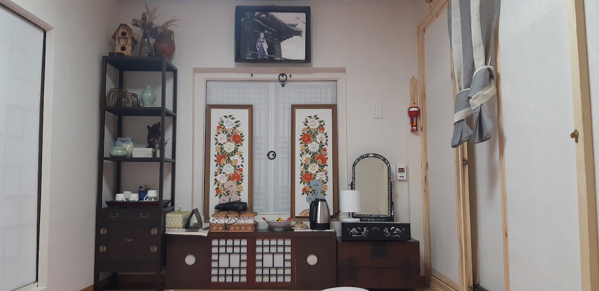 Exklusive Nutzung von Sarangchae (großes Zimmer, kleines Zimmer, Wohnzimmerboden, Balkonboden, eigenes Bad, Waschbecken) und riesiger Garten, Darüber hinaus gibt es ein mittleres Zimmer und einen Dachboden, sodass du bis zu 12 Personen beherbergen kannst, wenn du möchtest. In der Nähe des Stadtzentrums, leicht zu erreichen und innerhalb von 20 Minuten von jedem Reiseziel entfernt. Kostenloses Gartengemüse.