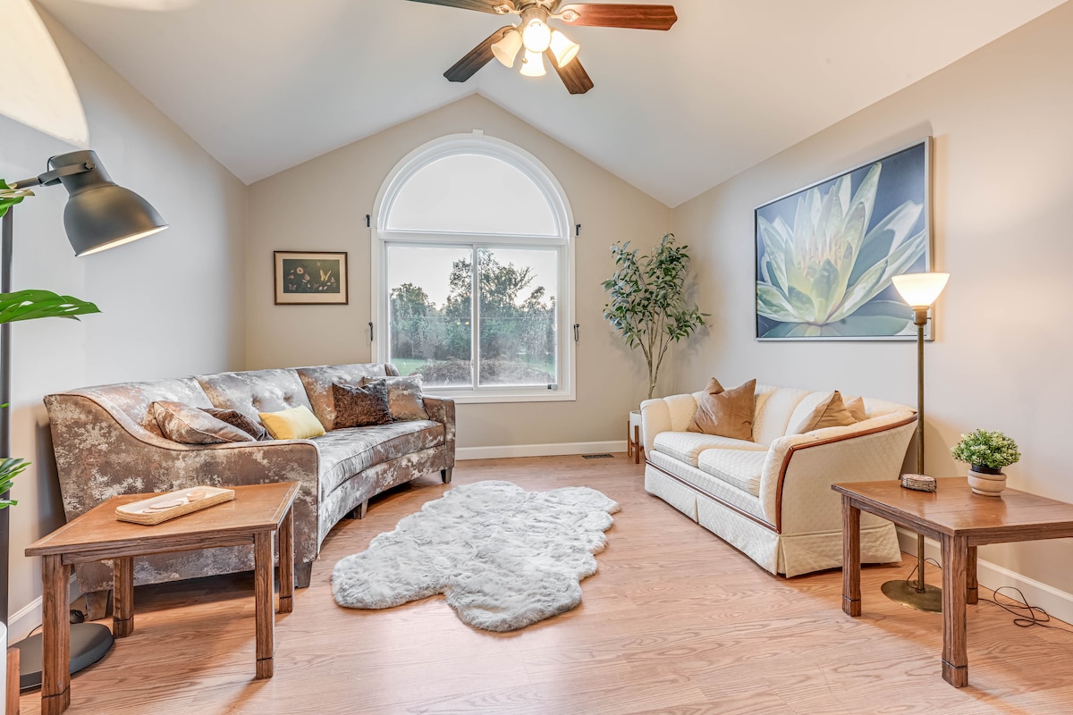 Entspanne dich in diesem renovierten Haus aus der Mitte des Jahrhunderts, Hillside Manner. Es ist von Wäldern umgeben, sodass es sich privat anfühlt. Du kannst im Kathedralen-Essbereich oder in den wärmeren Jahreszeiten auf der hinteren Terrasse essen. Die Matratzen und Kissen sind aus Memory-Schaum, der Amazon Smart-TV ist mit WLAN verbunden und die große Küche bietet alles, was du brauchst. Perfekt für Familien und Freundesgruppen, die 3 Schlafzimmer bieten Platz für bis zu 6 Gäste. *Der Gastgeber bewohnt eine Wohnung im ersten Stock, die völlig separat ist. Keine Gruppen von mehr als 10 Personen!