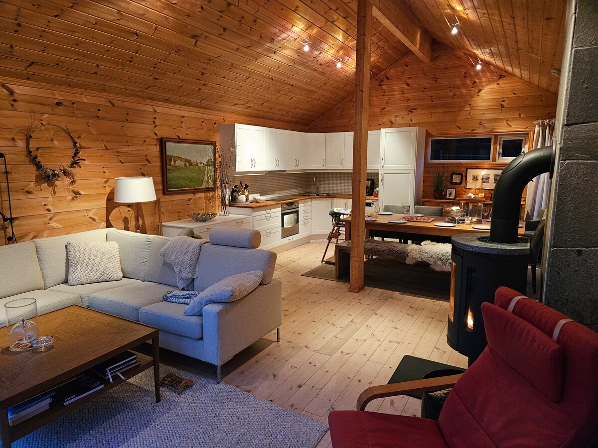 Traditionelle norwegische Blockhütte mit Holz beheizten Sauna auf einem weiten privaten Grundstück – eine ruhige digitale Auszeit. Kein Verkehr, keine Lichtverschmutzung und begrenzter Empfang. Wandern Sie auf Waldwegen, genießen Sie die Aussicht auf die Berge und beobachten Sie, wie sich die Sterne bis zum Horizont erstrecken. Eine reiche, biodiverse und unberührte Natur, in der Adler gleiten und Eulen rufen. Entspannen Sie sich in der Sauna und genießen Sie ein erfrischendes Bad im See.