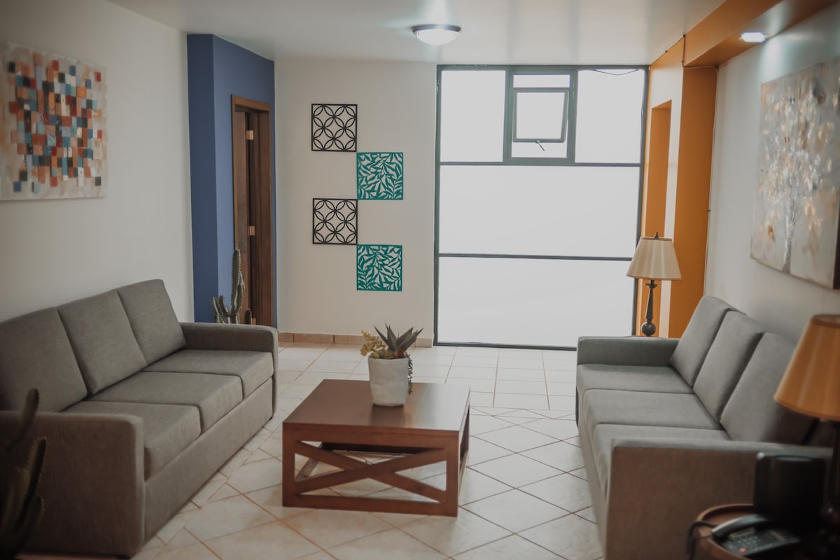 (110 m²) Spacious Family Apartment in Excellent Location! A block and a half to the Alameda Central García de la Cadena "Callejoneadas", 3 blocks to the Edén Mine+Cable Car Ride+La Bufa Hill, Fátima Church, Goitia Museum, 4 blocks to Hotel Quinta Real! In the Beauty and Security of the Historic Center enjoy our amazing Panoramic View with all the comforts: Wi-Fi, Smart TV 42 ", Cable, Netflix, Equipped Kitchen, Quartz Heaters & Fans, Automatic Hot Water 24/7, Parking lot 1 car. Welcome!