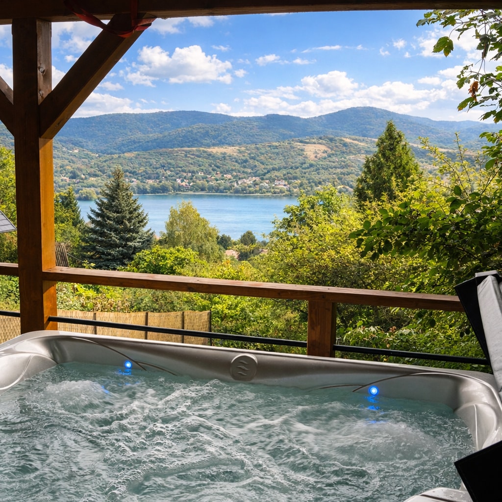 Vendégházunk Zebegényben egy lélegzetelállító panorámájú helyen van. A ház különleges hangulata a tájba illő egyedi tervezésnek és a természetes anyagok harmonikus felhasználásának köszönhető. Egyedi kézzel festett különleges dél-kelet ázsiai bútorok teszik varázslatossá. Ékessége a fürdőszoba és az azt elválasztó gyönyörű, kézzel festett-faragott indonéz teakfa ajtó. Egyedülálló élményt nyújt a teraszon egy pezsgő fürdő a jakuzziban vagy egy gyertyafényes meleg fürdő a hálószobában.