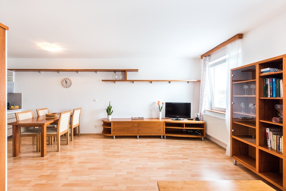 Die Wohnung befindet sich 10 Gehminuten vom Messegelände, 10 Minuten vom Zentrum der Reproduktionskliniken (IVF-Klinik reproGenesis, Unica, Reprofit), 5 Minuten von der Fakultät für Wirtschaft und Verwaltung der Masaryk-Universität entfernt. In ca. 30 Minuten können Sie das historische Stadtzentrum zu Fuß erreichen. In Reichweite des Radwegs, der den Brünner Stausee und das Einkaufszentrum Olympia verbindet.